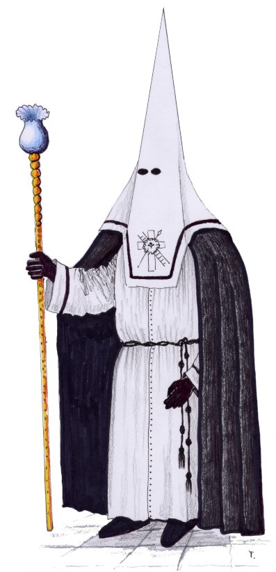 Capirote: blanco, con pasamanería negra siguiendo el perímetro del mismo, con Escudo bordado en negro a la altura del pecho.